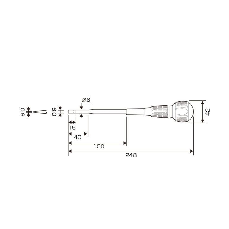 This individual screwdriver is a Slotted 6mm x 150mm with a full length of 248mm. More individual screwdrivers from this line can be found here.