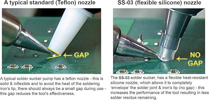 The Engineer SS-03 is a professional-grade desoldering tool and the go-to choice for electronics repair. Unlike ordinary solder suckers, it features a heat-resistant silicone nozzle that can be pressed directly onto solder joints without melting. The flexible tip creates a tighter seal, giving stronger and more reliable suction.