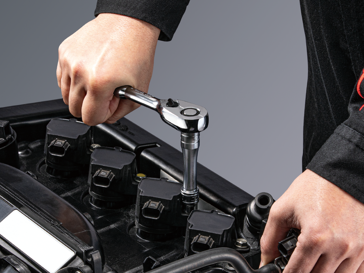 The KTC BR390 is a professional-grade 9.5sq. (3/8") drive ratchet designed for technicians who need precision in tight engine bays without sacrificing heavy-duty durability. Upgraded with a high-density 90-tooth gear system, it delivers a tight 4° feed angle, allowing you to click and turn fasteners in cramped spaces where standard ratchets fail.
