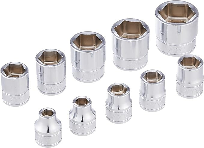The KTC TB310 is a 10-piece hex (6-point) socket set designed for strong, reliable grip and reduced fastener damage. These sockets feature KTC’s Powerfit design, which improves how the socket contacts the nut or bolt head.