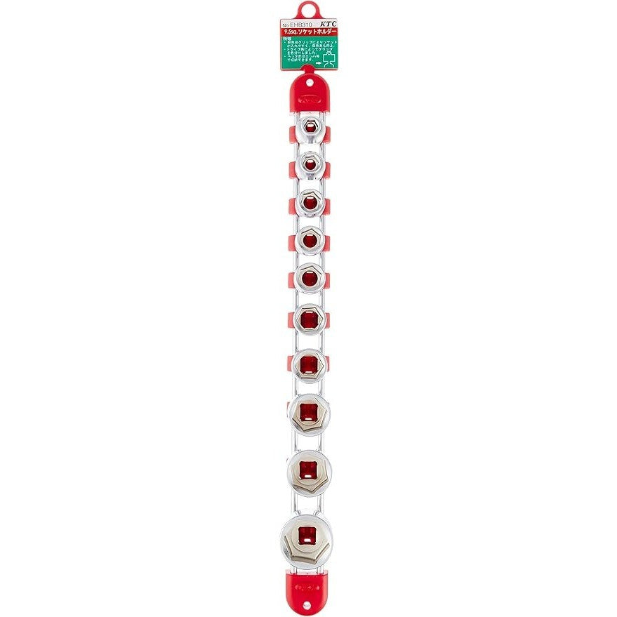 The set also includes the KTC EHB310 socket holder, designed to keep all 10 sockets organised and easy to access. The holder is magnetic, so it can stick securely to metal surfaces like toolbox lids or cabinets, and it also features pre-drilled holes for permanent screw mounting, giving flexible options for both mobile and fixed workshop setups.