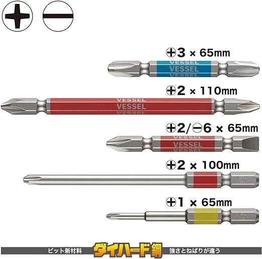 An Assorted pack of bits from Vessel’s “GO-SAI” line to suit many applications. This line uses Vessel’s new and unique steel “Extra Superalloy” made specifically for bits. This material is incredibly durable and ductile and therefore are resistant to twisting and breaking. The highly precise machined tip end is magnetised and fits tightly into various screws allowing for a more efficient application of torque.