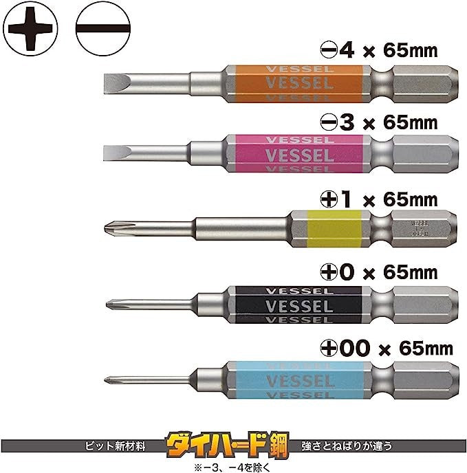 An Assorted pack of precision bits from Vessel’s “GO-SAI” line, suitable for small screw sizes. These bits all have thin shanks for use in narrow holes. This line uses Vessel’s new and unique steel “Extra Superalloy” made specifically for bits. This material is incredibly durable and ductile and therefore are resistant to twisting and breaking. The highly precise machined tip end fits tightly into various screws allowing for a more efficient application of torque.