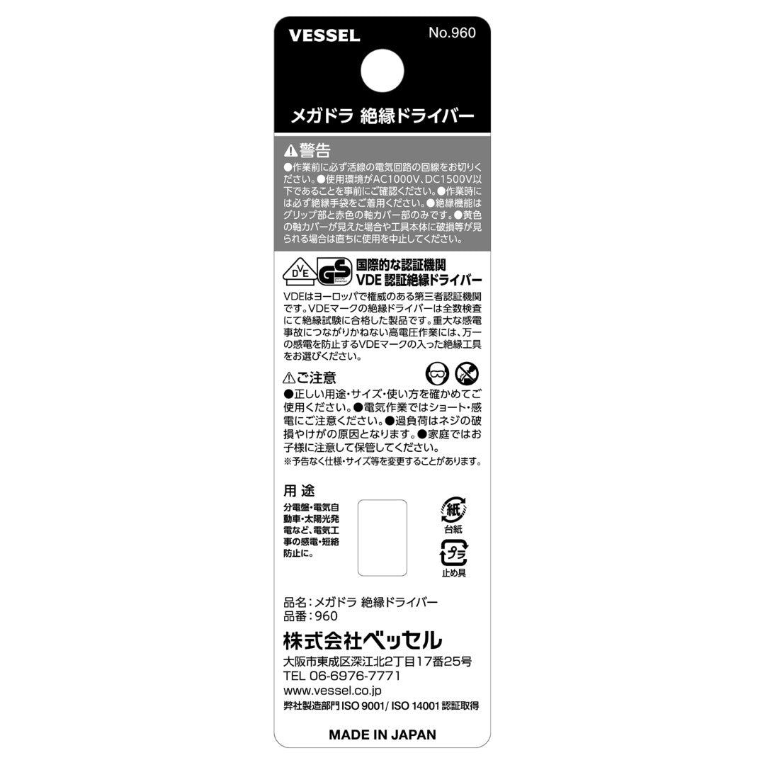 This is an individual Insulated screwdriver from Vessels flagship “MEGADORA” line, this screwdriver is 1000v VDE certified and is perfect for electrical work of all kinds. The handles are comfortable and designed for optimal contact area and feature a hard, smooth and non slip surface for maximum grip in any situation, even when hands are oily. The tips are also highly precise and magnetised for ease of use.