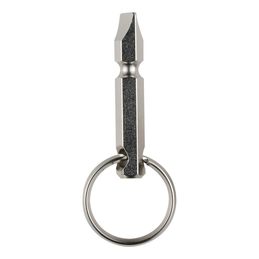 This incredibly simple yet handy tool allows you to attach a keyring onto a bitholder. Giving your tool bag or belt a handy place to store your keys. The bit can also be used as a pry in a pinch for things like paint can lids.